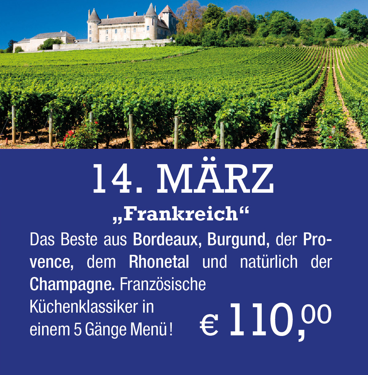 Am 14. März 2026 ab 18:30 Uhr laden wir Sie zu einem stilvollen Frankreich Abend ein.