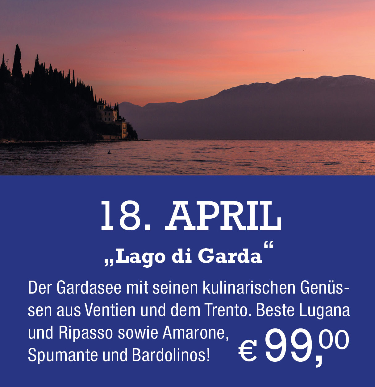 Am 18. April 2026 ab 18:30 Uhr laden wir Sie zu einer genussvollen Reise an den Gardasee ein.